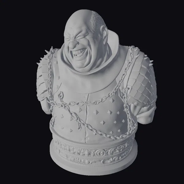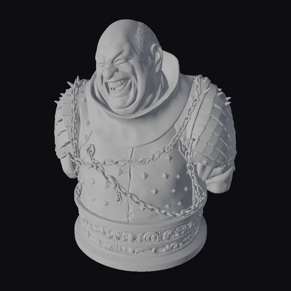 This intricately designed bust showcases a Baroque Sadist with a bald head and a face twisted in a snarl, revealing his sharp teeth. His armor, a masterpiece of baroque design, features a mix of dark and golden hues, adorned with spikes, chains, and detailed engravings. The pose, captured in a state of dynamic tension, suggests a story of confinement and unleashed brutality. The bust’s base is equally detailed, with a decorative band that adds to the overall opulence of the piece. Ideal for use in games, 3D printing, VR/AR experiences, animation, and design projects, this model brings a touch of dark fantasy to any creative endeavor.