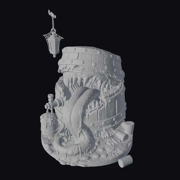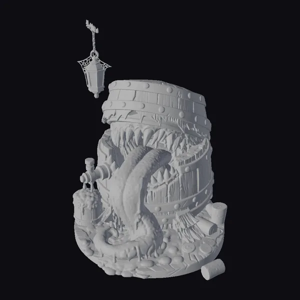 This intricately detailed model showcases a wooden barrel with metal bands, its staves bursting open to reveal a serpent slithering out. The barrel’s texture and the serpent’s scales are meticulously rendered, capturing the organic and industrial elements in stunning clarity. The scene is littered with debris, including wooden logs and a small bucket, adding to the post-apocalyptic ambiance. A lantern hangs above, casting a dim glow on the chaotic scene below. Ideal for use in games, 3D printing, VR/AR experiences, animation, and design projects, this model brings a touch of dark fantasy to any creative endeavor.