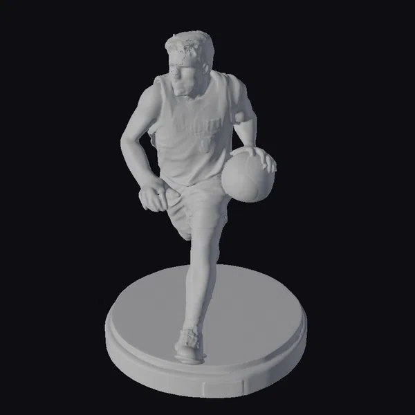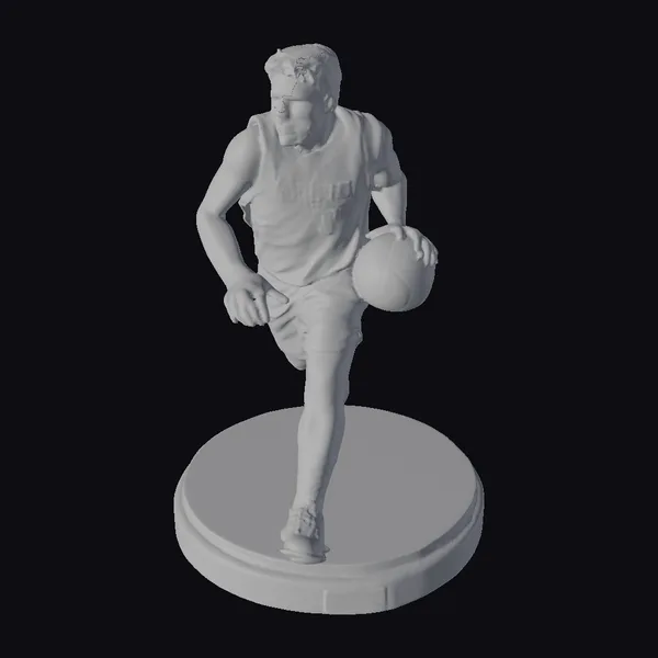 In a dynamic stride, the basketball player seems to leap off his circular base, basketball at the ready. His short hair is tousled, and his eyes are focused intently on some unseen opponent or goal. The jersey clings to his sweaty torso, and his shorts and socks are detailed with precision. The sneakers, with their intricate laces, appear ready to hit the court at a moment’s notice. This model’s realistic style and attention to detail make it perfect for use in sports-themed games, animations, or as a decorative piece. Its applications extend to architectural visualizations, especially in sports facilities or retail spaces, and it could also serve as a compelling character in VR/AR experiences.