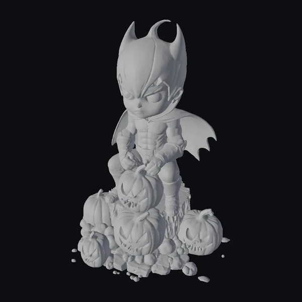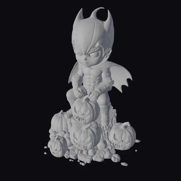 This charming 3D model depicts a bat boy sitting on a pile of intricately carved pumpkins, surrounded by a few scattered around the base. The bat boy’s costume is detailed with a black and red design, complete with a cape and a distinctive bat-like headpiece. The pumpkins, varying in size, are adorned with glowing eyes and mouths, adding a spooky yet friendly ambiance. The model is posed on a tree stump, with some pumpkins and debris scattered around, enhancing the seasonal feel. The stylized, cartoonish style makes it ideal for use in animations, games, or as a decorative element for Halloween-themed projects. The model’s unique blend of cuteness and spookiness makes it a versatile asset for designers and creators.