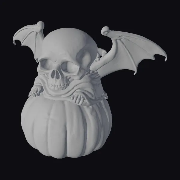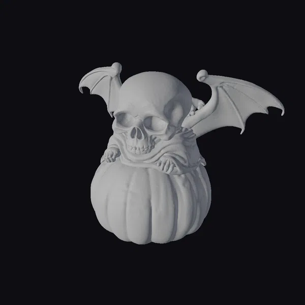 This captivating statue combines three creatures in a single, eye-catching design: a stylized skull with a wide, toothy grin, a pair of bat wings sprouting from its back, and a pumpkin carved with a bat silhouette serving as its base. The skull’s eyes are empty sockets, adding to the spooky allure. The bat wings, with their detailed veins and smooth texture, contrast beautifully with the rough, bony skull. The pumpkin, with its ridged surface and vibrant orange color, provides a sturdy base. This model is perfect for Halloween-themed games, animations, or 3D printing projects, offering a unique blend of horror and whimsy.
