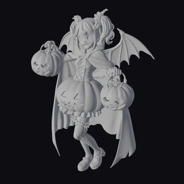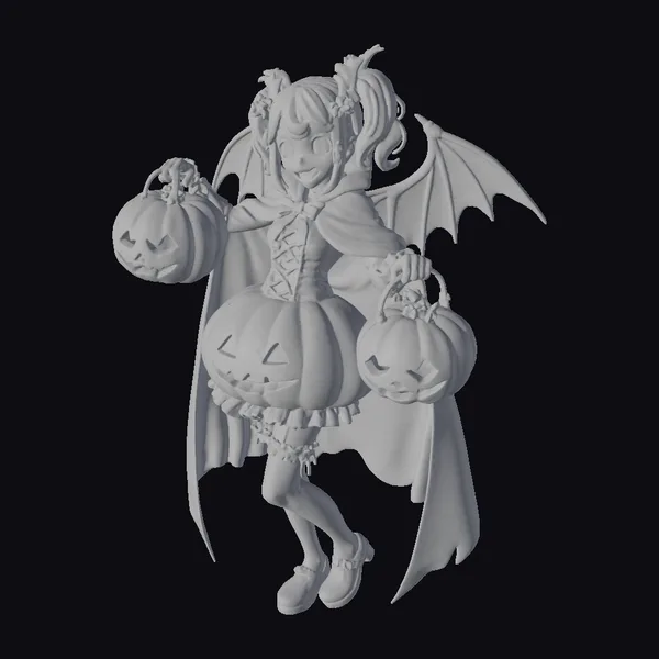 Floating dynamically against a crisp white background, the Bat Wing Pumpkin Girl model presents a detailed visual feast. Her orange hair is styled in pigtails adorned with small black bats, complementing her black dress with an orange corset and a flowing cape. The girl’s pose is dynamic, with her legs crossed and arms holding three intricately carved pumpkins. The model showcases high-quality textures, with the pumpkins and dress featuring intricate details. The stylized, cartoonish style makes this model perfect for use in games, animations, or 3D printing projects that require a festive and fantastical character. The model’s unique blend of Halloween elements and cute design makes it an excellent addition to any project.