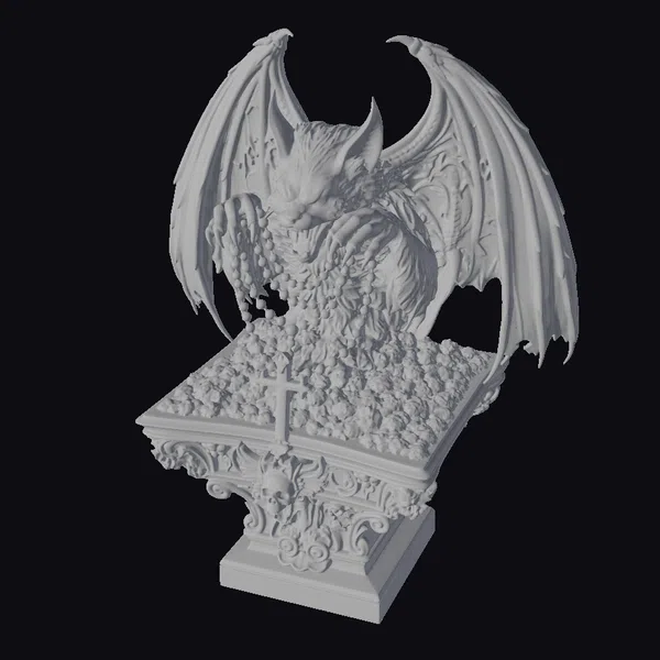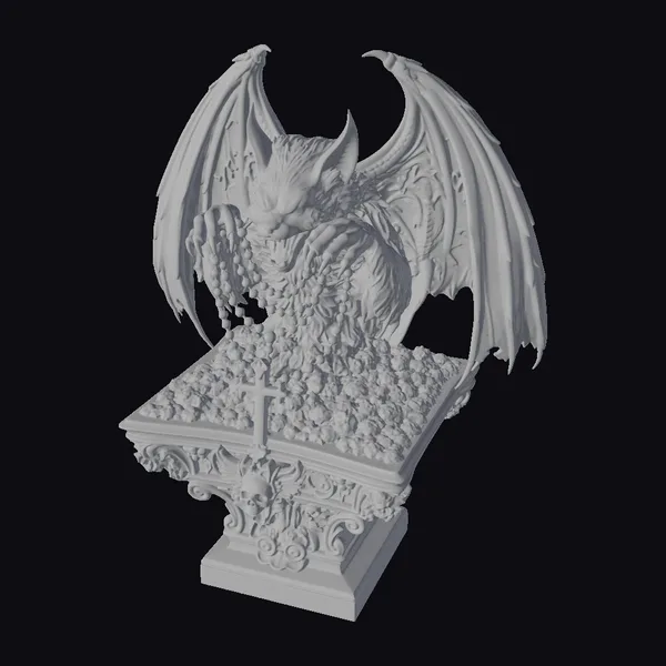 This striking figurine captures a bat-like creature in a moment of eerie contemplation. Positioned atop a richly detailed book, the creature’s claws grasp a strand of white rosary beads, while its gaze is fixed on a silver cross. The bat’s wings, a deep black with hints of gray, are spread wide, as if ready to take flight. The creature’s face is a masterful blend of bat-like features and eerie, human-like expressions, with yellow eyes that seem to pierce through the darkness. The base of the figurine is a work of art in itself, with gold accents and swirling patterns that evoke a sense of ancient mysticism. The overall effect is one of dark, gothic elegance, perfect for those who appreciate the mysterious and the unknown. Ideal for use in games, 3D printing, VR/AR experiences, animation projects, or as a unique design element.