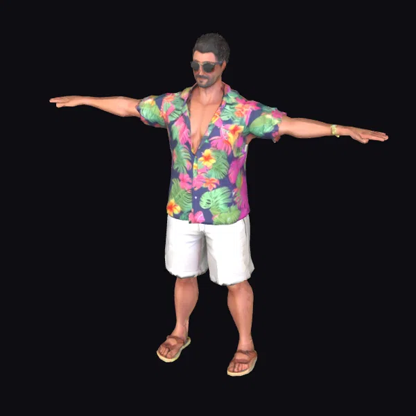 Standing tall with arms outstretched in a classic T-pose, this male bartender avatar is ready to bring a touch of beachy charm to your projects. His short, dark hair and stubble add a rugged edge to his otherwise polished appearance. The floral shirt, a kaleidoscope of pinks, greens, and yellows, contrasts beautifully with his white shorts and brown sandals. Sunglasses and a wristband complete his laid-back look. Textures are smooth, with a slight sheen to fabrics and accessories, suggesting a high level of detail suitable for close-up shots. This model is perfect for projects requiring a relaxed, beach-inspired character, such as animations, games, or virtual environments. Its stylized yet realistic appearance ensures it will blend seamlessly into various creative contexts.