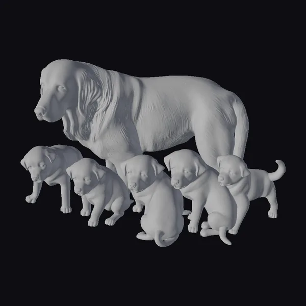 Rendered in exquisite detail, the beagle mother and her five puppies are posed in a natural, endearing setting. The mother’s coat shines with a light golden hue, complemented by her white markings, while the puppies exhibit a similar color palette with distinctive white patches on their foreheads. Their little paws, floppy ears, and curious expressions bring their playful interaction to life. This model suite is perfect for projects requiring a realistic yet heartwarming canine family presence, suitable for animations, games, or design projects that call for authentic animal characters.