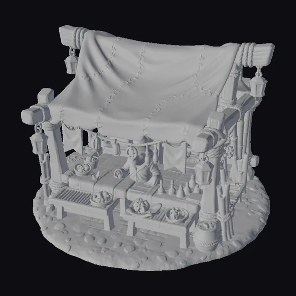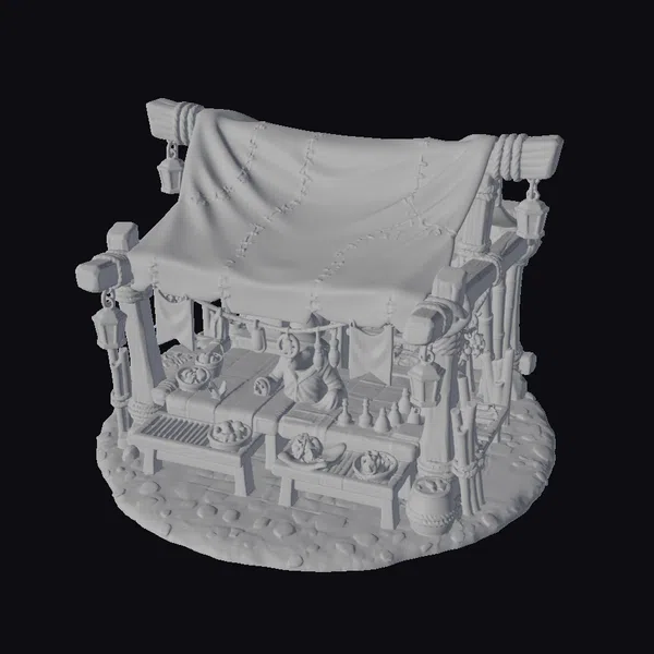 Detailed within this enchanting 3D model is a bear-operated market stall, meticulously crafted with a mix of bamboo, wood, and fabric elements. The stall’s roof is a patchwork of earthy tones and green hues, adorned with hanging lanterns and various food items. The bear, dressed in a simple white shirt, sits among the goods, adding a personal touch. The stall itself is arranged with several wooden tables, each laden with baskets of fruits, vegetables, and other treats. The entire setup is placed on a stone-paved surface, surrounded by bamboo stalks and illuminated by soft, warm lighting. This model is ideal for use in games, animations, or virtual reality experiences, offering a unique and captivating element to bring fantasy worlds to life.