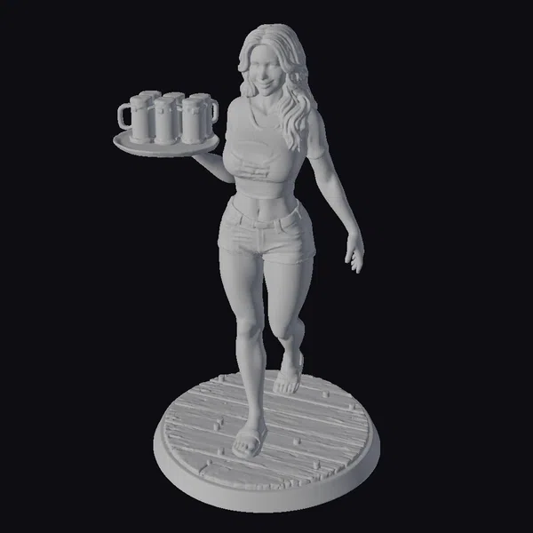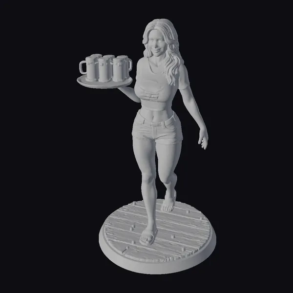 Detailed from her stylish, long wavy brown hair to her brown sandals, this figurine exudes a carefree vibe. She wears a light blue crop top adorned with a pig design and light blue shorts, holding a tray with four beer mugs in her right hand. The tray and mugs showcase a realistic, frothy beer effect. Standing on a circular gray wooden base with scattered ice cubes, she appears ready to serve at a summer gathering. Her application possibilities range from adding a playful touch to game environments, 3D animations, or architectural visualizations to serving as a unique decorative piece in interior designs.