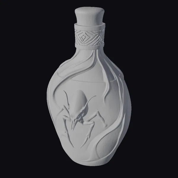 The beetle, rendered in exquisite detail with a glossy finish, seems to hover within the crimson liquid, its multiple legs splayed as if in mid-struggle. The glass bottle’s body is irregularly shaped, wider in the middle and tapering towards the stopper, which is adorned with a metallic wrapping that resembles ancient filigree. Light catches the glass in such a way that the red liquid appears both vibrant and deep, almost alive. The wisps of something ethereal swirl around the beetle, adding a sense of movement and mystery. This model would be perfect for use in dark fantasy settings, perhaps as a prop in a game, animation, or even a piece of digital art. Its unique blend of horror and mysticism could also make it a compelling addition to any 3D printed collection.