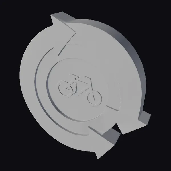 Floating dynamically against a clean backdrop, this 3D model showcases a stylized bicycle at its center, embraced by a circular arrow that signifies recycling, sustainability, and the continuous life cycle of eco-friendly transportation. The bicycle itself is rendered in a sleek, dark gray that stands out against the white circular base, which is then enveloped by a gradient ring transitioning from deep blue to radiant orange. This gradient not only adds a pop of color but also metaphorically represents the journey or phases a bicycle goes through, from production to recycling. The entire emblem exudes a sense of modernity and environmental consciousness, making it an excellent choice for a wide range of applications, from game assets and animations to architectural visualizations and eco-focused marketing materials.