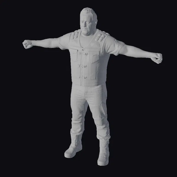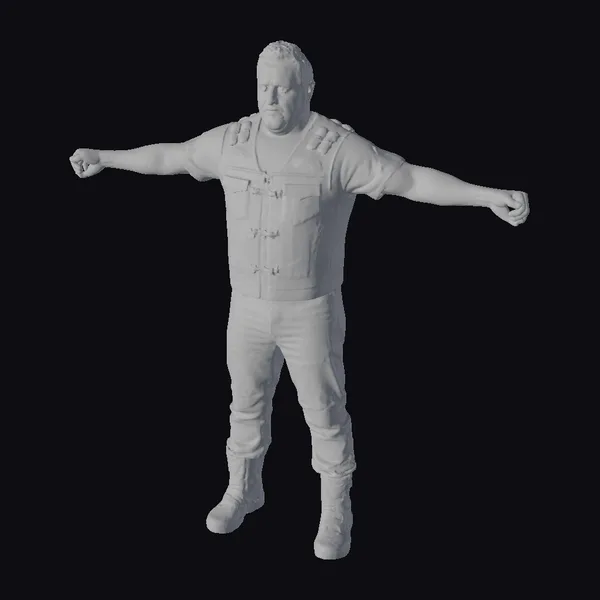 Standing confidently with arms outstretched, this 3D model of a biker club member showcases a meticulously designed outfit. The black leather vest, embellished with red and white patches and a striking ‘Biker’s Life’ logo on the side, is the centerpiece. Paired with a black t-shirt, dark blue jeans, and rugged black boots, the model exudes a tough, rebellious spirit. The realistic style and attention to detail make this model perfect for use in games, 3D printing, VR/AR experiences, animation, and design projects. The high level of detail in the vest’s texture, the stitching on the clothing, and the overall pose make this model a versatile asset for various applications.