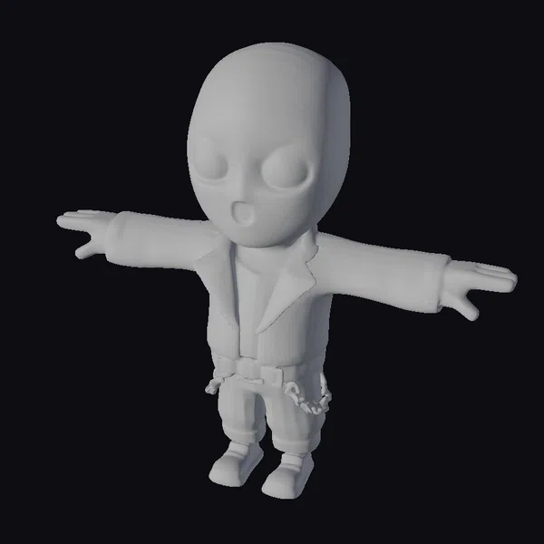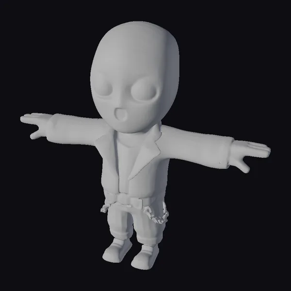 Standing out with its unique blend of edginess and playfulness, this biker toy figure is meticulously detailed with a black balaclava covering its head, a brown leather jacket adorned with silver buttons, and matching pants and shoes. A thick chain cinches at its waist, adding to its rebellious charm. The figure’s arms are outstretched in a dynamic pose, showcasing its cartoonishly large eyes and expressive face. Ideal for animations, games, or any project requiring a dash of whimsy and character, this model brings personality and style. Its stylized appearance makes it versatile for various creative applications, from children’s content to more mature themed projects.