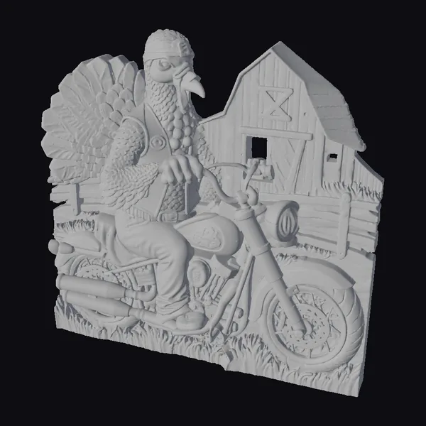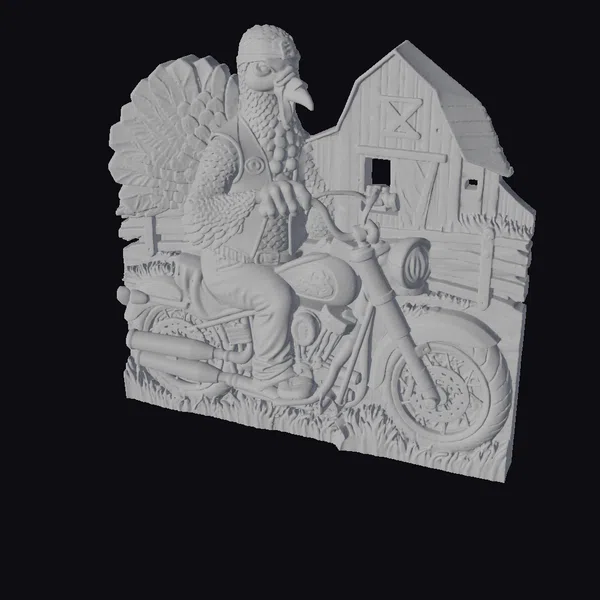 This stylized model showcases a turkey dressed as a biker, sitting on a motorcycle in front of a rustic barn. The turkey’s feathers are rendered in intricate detail, with a shiny golden finish that catches the light. The motorcycle is adorned with a wooden sidecar and features a detailed engine and exhaust pipes. The barn behind it boasts a classic rural design, complete with a hayloft and wooden fence. The entire scene is bathed in a warm, golden light, giving it a unique and captivating atmosphere. Ideal for use in games, animation, or as a decorative piece, this model is sure to stand out.