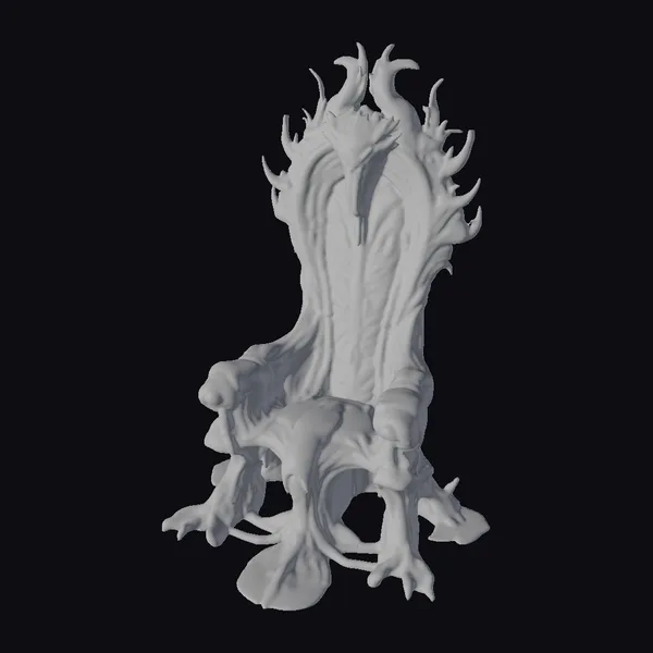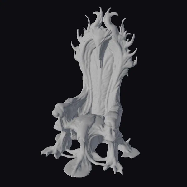 Perched atop a base that resembles a mass of twisted, organic roots, the throne’s high back is adorned with curved, flame-like protrusions that appear to be made of the same dark, chitinous material as the rest of the chair. The seat and backrest are a deep, glowing red, with a texture that suggests the scales of some ancient, subterranean creature. The armrests are shaped like grasping claws, adding to the overall sense of unease and foreboding. As light catches the throne’s surface, the glossy finish seems to shift and ripple, as if the very fabric of the chair is alive. This 3D model would be perfect for adding a touch of sci-fi horror to games, animations, or VR/AR experiences, and could also be used in design projects that require a truly unique and otherworldly aesthetic.