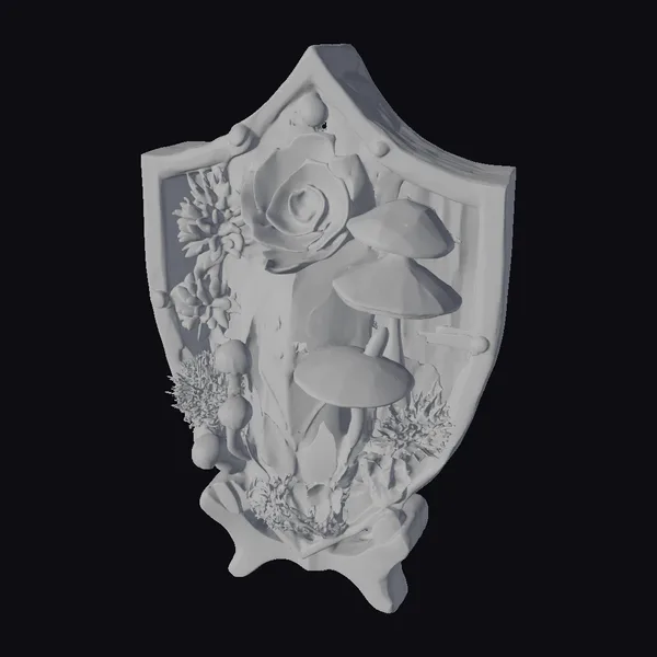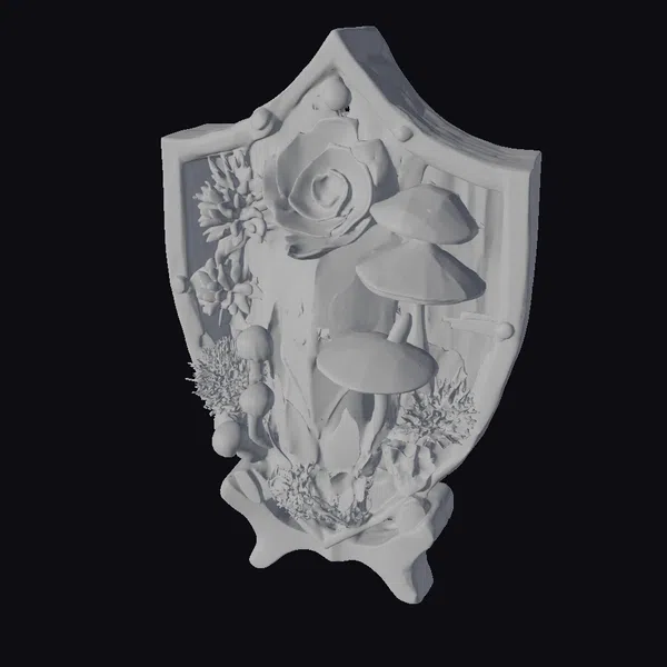 This stunning decorative shield boasts a detailed, stylized design that transports you to a fantastical realm. The wooden shield itself is beautifully crafted, with a rich brown texture that provides a natural backdrop for the vibrant flora. A large, blue-green succulent takes center stage, surrounded by smaller succulents and a cluster of mushrooms in shades of orange, pink, and red. The bioluminescent accents add an otherworldly glow, as if the shield is radiating an soft, magical light. The shield is mounted on a decorative wooden stand, complete with a dark background that enhances the colors of the succulents and mushrooms. This model is perfect for use in games, 3D printing, VR/AR experiences, animation, and design projects, where a touch of fantasy and whimsy is desired.