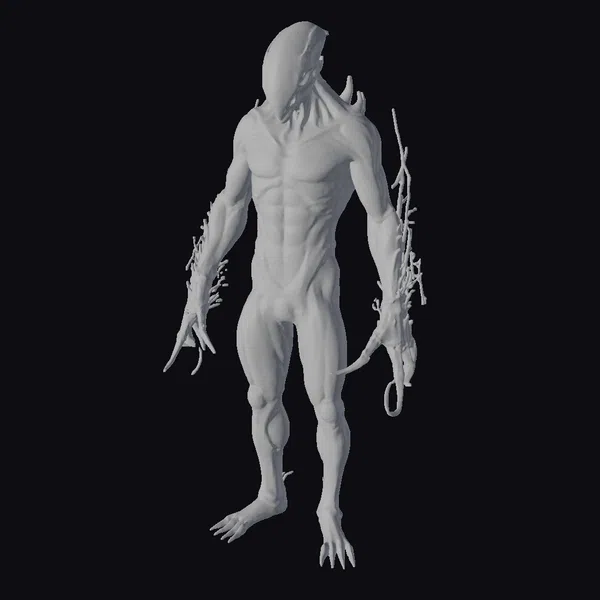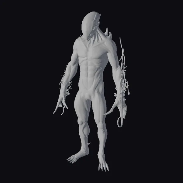 Standing tall, this bioluminescent xenotech warrior exudes an aura of foreboding, its very presence seeming to darken the air around it. The intricate details of its xenotech armor are a testament to a fusion of organic and synthetic materials, with a predominantly dark color scheme punctuated by glowing blue lines that pulse with an otherworldly energy. The creature’s pose, with one arm hanging loose and the other grasping a strange, organic-looking device, conveys a sense of relaxed menace. Its use in games, animation, or VR/AR applications would undoubtedly add a touch of sci-fi horror, while its design could also inspire concept art or serve as a reference for 3D printing projects. The model’s blend of dark, muted tones and vibrant, glowing accents creates a visually striking contrast that draws the eye inexorably to the creature’s twisted form.
