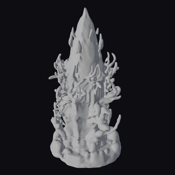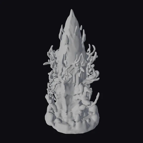 Perched atop a twisted base, the biomechanical guard tower rises like a living entity, its surface a complex latticework of metallic and crystalline structures. The tower’s core is dominated by a massive, sharp crystal that pulses with a vibrant purple light, casting an ethereal glow across the surrounding environment. This 3D model showcases intricate details, from the organic tendrils snaking around the tower’s base to the jagged, emerald-hued protrusions that give it a formidable, defensive appearance. Ideal for use in sci-fi games, animations, or architectural designs, this model brings a touch of futuristic menace to any project.