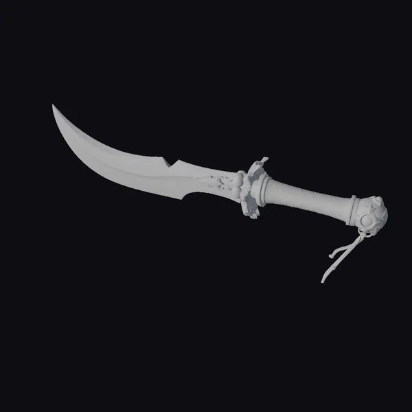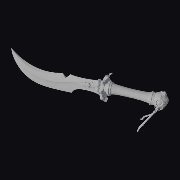 This extraordinary biomechanical katana relic lies before you, its curved, single-edge blade glinting with an ethereal blue translucency. The blade’s shape, reminiscent of a deep-sea predator’s fang, speaks to its ancient, abyssal origins. The black handle, wrapped in a textured material, provides a stark contrast to the glowing blue accents that adorn the guard and pommel. A small, blue gemstone set into the pommel adds a touch of mysticism to the overall design. As a 3D model, this katana is poised to bring a touch of sci-fi menace to games, print projects, VR/AR experiences, animations, or design visualizations.