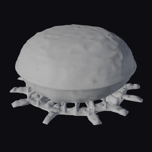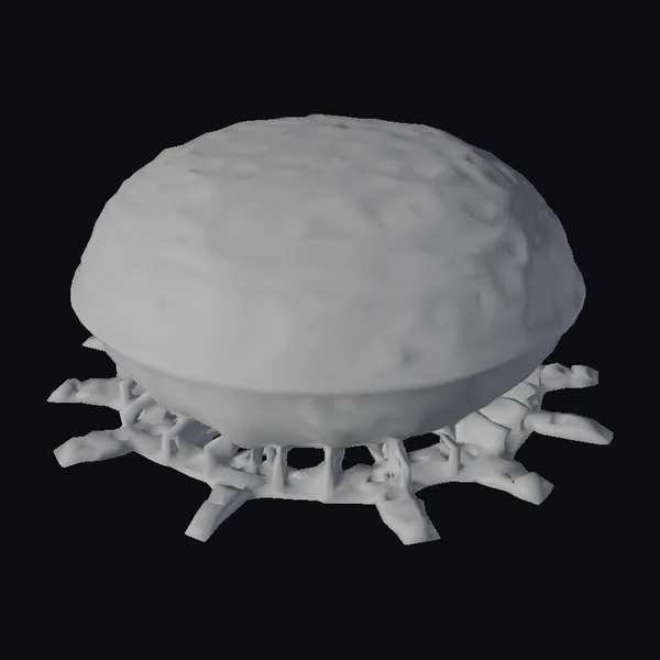 Perched on a base that resembles a mechanical organism, this biomechanical oval building radiates an otherworldly aura. The dome’s surface is a complex network of interlocking mechanical parts and translucent biological material, illuminated from within by glowing purple, pink, and blue energy. The structure’s pose, with its base extending outward in a radial pattern, suggests dynamic movement and energy emission. The textures are rich and detailed, with visible mechanical components and a sense of depth within the glowing interior. This model is perfect for use in sci-fi games, animations, or architectural designs that require a futuristic, high-tech aesthetic. Its unique blend of organic and mechanical elements makes it an eye-catching centerpiece for any project.