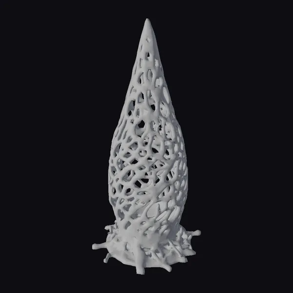 Perched on a base that resembles roots or tendrils, this biomechanical tear drop structure rises majestically, its pointed apex reaching for the sky. The surface is a complex latticework of organic and mechanical elements, with a color scheme that shifts between purple, pink, and blue, giving it a mesmerizing, glowing effect. The intricate details and textures suggest a fusion of natural and synthetic materials, perfect for sci-fi environments, futuristic cityscapes, or conceptual designs. Its unique blend of form and function makes it an ideal centerpiece for games, animations, or architectural visualizations.