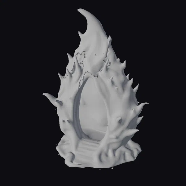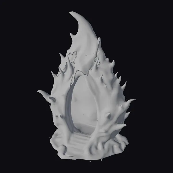 Perched atop a rugged base, this biomechanical marvel rises into a sharp, curved spire, as if frozen in a moment of dynamic movement. The surface is a complex interplay of organic, wavy lines and mechanical, jagged edges, with glowing red, purple, and orange accents that pulse like a living entity. As the eye travels upward, the teardrop shape seems to shift and morph, defying conventional architectural norms. This 3D model is perfect for adding a touch of sci-fi flair to games, animations, or architectural visualizations. Its unique blend of futuristic and organic elements invites the viewer to explore the boundaries between technology and nature.