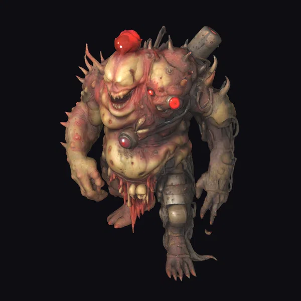 This bionic ogre mutation stands with a menacing posture, its body a mass of bulging, bloodshot flesh merged with cold, metallic cybernetic enhancements. The ogre’s face is a twisted visage of terror, complete with sharp teeth and a distended belly that seems to be on the verge of bursting. Red lights glow from its eyes and a bulbous growth on top of its head, casting an eerie light on the surrounding environment. Its arms end in sharp claws, while its lower body is encased in a metallic exoskeleton, suggesting a powerful fusion of organic and synthetic components. This model is perfect for projects delving into the realms of science fiction, horror, or fantasy, particularly in the creation of immersive environments, character designs, or narrative-driven animations.