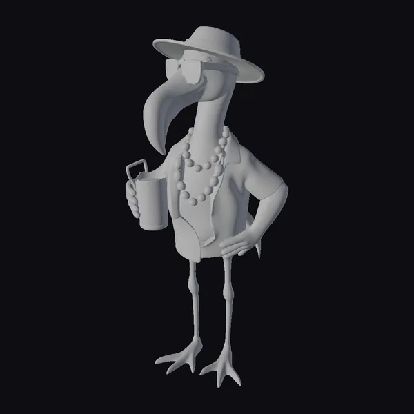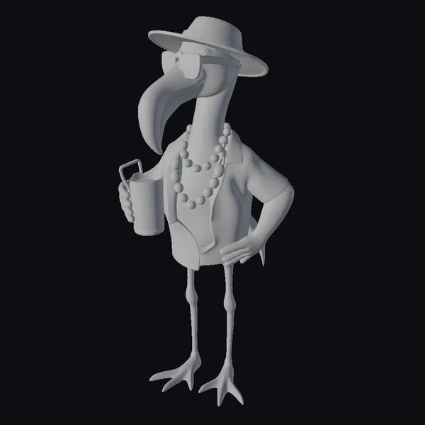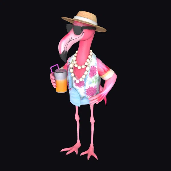 Standing tall on two legs, this delightful bipedal flamingo character is meticulously detailed with a bright pink plumage, a long neck, and a distinctive beak. The character’s pose is relaxed, with one hand on its hip and the other grasping a colorful tropical drink complete with a straw. The flamingo’s outfit consists of a white and pink Hawaiian shirt, light blue shorts, and a pair of sunglasses perched on its beak. A stylish straw hat tops its head, while a beautiful puka shell necklace adds a touch of elegance around its neck. The model’s textures are smooth and cartoonish, with a clear emphasis on a fun, stylized appearance. The lighting highlights the character’s vibrant colors and accessories, making it perfect for various creative projects such as games, animations, or 3D printing. Its playful demeanor and summer attire evoke a sense of fun and relaxation, making it an excellent addition to any project aiming to capture a lighthearted, tropical atmosphere.