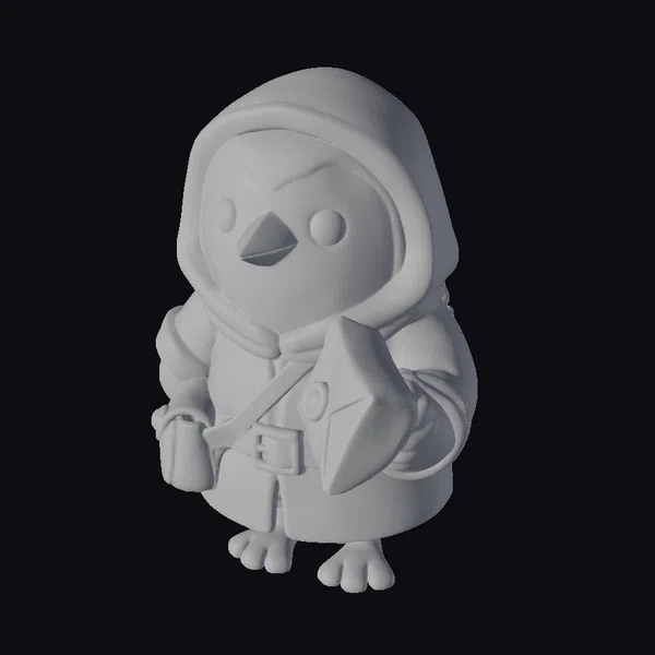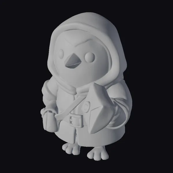 This stylized bird model is depicted wearing a detailed brown robe with a hood, complete with a belt and a pouch. The bird’s bright orange body and dark brown feet provide a striking contrast to its earthy attire. Holding a cream-colored letter in one hand and a small bag in the other, the bird appears ready for a journey. The model’s smooth textures and rounded features give it a cartoonish feel, making it perfect for use in animation, games, or as a decorative piece. Its fantasy elements and cute design make it a versatile asset for various creative projects.