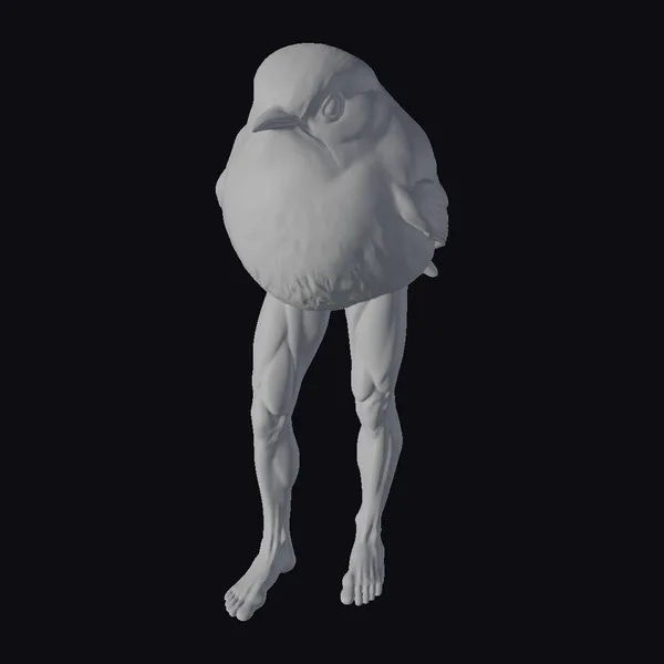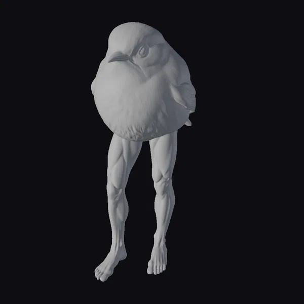 This stylized 3D model presents a captivating blend of avian and human elements, featuring a bird’s body complete with a mix of orange, gray, and white feathers, perched atop a pair of well-defined, muscular human legs. The contrast between the smooth, feathered torso and the detailed musculature of the legs creates a visually intriguing effect. The model’s pose, with legs slightly apart and toes pointed outward, suggests movement or readiness. The level of detail, from the texture of the feathers to the definition of the muscles, is high, making this model suitable for use in various creative projects such as animation, game development, or as a unique design element in virtual reality environments.