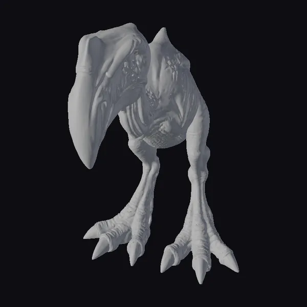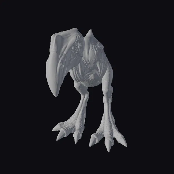 Perched menacingly, this bird-like fantasy creature showcases intricate details, from the texture of its scaly legs to the ridges on its powerful beak. Its yellow eye gleams with a fierce inner light, suggesting a sharp intelligence and primal ferocity. The creature’s pose, with legs tensed and claws extended, captures a moment of poised threat, as if it’s about to lunge at any moment. This 3D model would be perfect for adding a touch of dark fantasy to games, animations, or virtual reality experiences. Its unique blend of bird and reptilian features makes it a standout character in any scene.