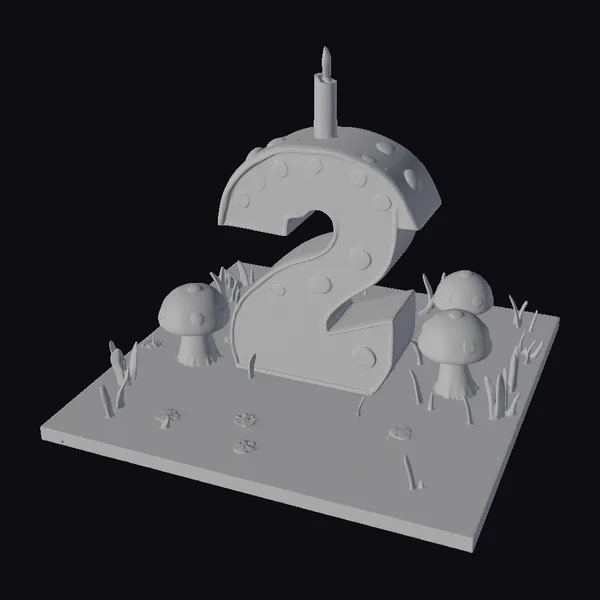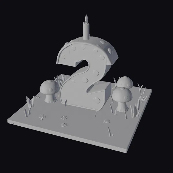 In a delightful scene, a stylized birthday cake stands proudly on a green base, covered in tiny mushrooms and flowers. The cake itself is a vibrant yellow number two, topped with a red mushroom cap featuring white spots and a small blue candle with a warm flame. The overall design exudes a playful and festive atmosphere, perfect for adding a touch of whimsy to any project. Whether used in animations, games, or 3D designs, this charming cake model is sure to bring a smile. Its detailed textures and bright colors make it a standout element in any scene.
