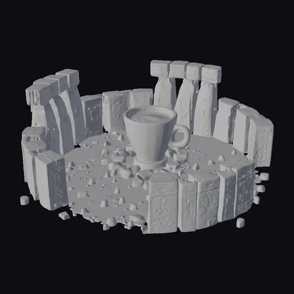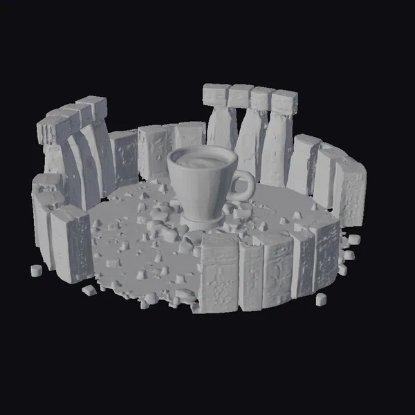 In a mesmerizing blend of the familiar and the fantastical, a steaming cup of tea takes center stage within a circular formation of biscuits, reminiscent of Stonehenge. The biscuits, with their golden-brown hue and textured surfaces, stand upright in a deliberate pattern, as if guarding the cup. The cup itself, a pristine white, is filled with a rich, amber liquid that seems to glow from within. Crumbs and small biscuit pieces litter the ground, suggesting a recent snacking activity. The entire scene exudes a sense of whimsy and wonder, inviting viewers to ponder the story behind this edible monument. Whether for a game, animation, or design project, this model brings a dash of humor and creativity to any 3D environment.