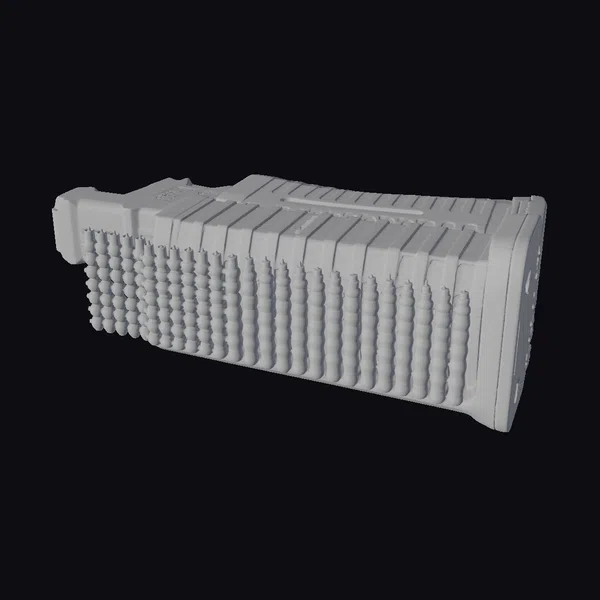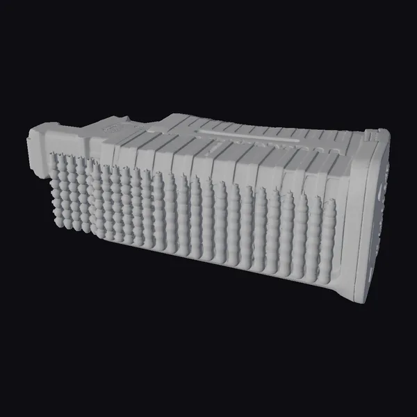 Detailed with precision, the black ammo box features a rugged design with a black metal body and a tan-colored handle on top. Rows of brown bullets are neatly arranged within, showcasing a sense of organization and functionality. The box’s textured surface and ridged top add to its realistic appearance. Ideal for use in 3D modeling, game development, or architectural visualization, this model brings a touch of realism to any project. Its high level of detail makes it suitable for close-up shots or as part of a larger scene.
