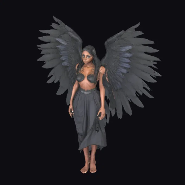 Standing tall with her expansive black wings spread wide, this majestic angelic figure commands attention. Her long, flowing black hair cascades down her back, complementing her dark attire that consists of a bra and a flowing skirt. The wings, a marvel of detail, showcase feathers with subtle gradations of black and dark blue, suggesting depth and realism. Her facial expression is serene yet mysterious, inviting onlookers to ponder her story. This model is perfect for projects requiring a touch of fantasy and mystique, such as animations, games, or architectural visualizations aiming for a unique aesthetic. Its detailed features and realistic textures make it an excellent choice for high-end projects.