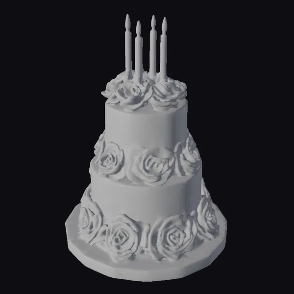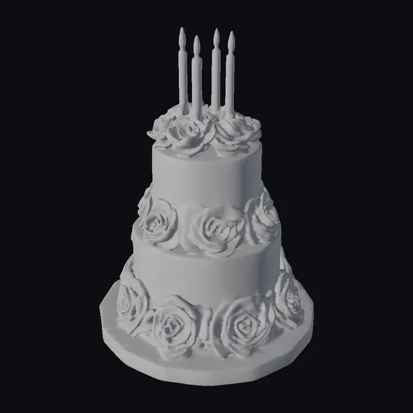Detailed with precision, this three-tiered black cake stands majestically on a matching black base, each tier encircled by meticulously crafted black roses that add a touch of somber beauty. The top of the cake is crowned with four black candles, their flames flickering with a warm, golden glow. The matte finish of the cake contrasts beautifully with the slightly glossy texture of the roses, creating a visually appealing contrast. The overall design is a masterful blend of simplicity and detailed artistry, making it a perfect centerpiece for gothic-themed parties or as a unique decorative piece. Ideal for use in games, 3D printing, virtual reality experiences, animations, or architectural designs where a touch of dark elegance is desired.