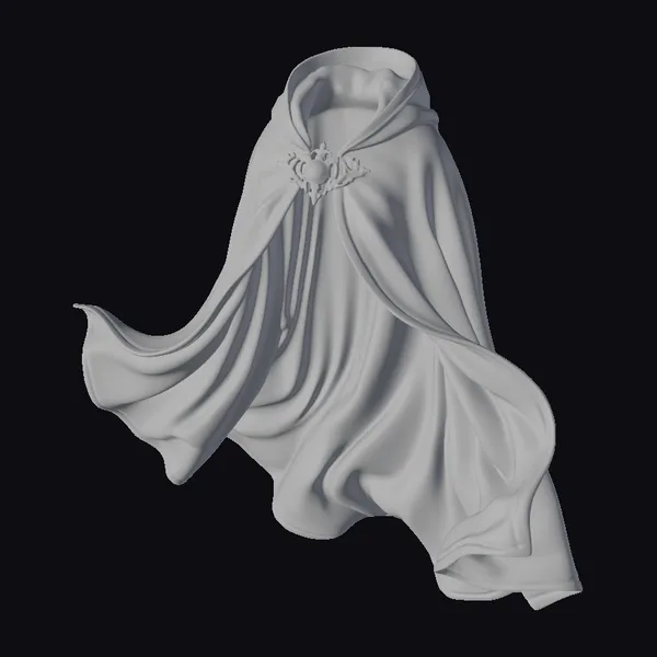 The black cape is rendered in exquisite detail, with folds and creases that give the impression of dynamic movement, as if it’s being blown by an invisible wind. The fabric has a smooth, luxurious texture, reflecting light subtly to enhance the realistic effect. At the center, a metallic brooch shines with a complex design, adding a focal point to the overall piece. The brooch’s reflective surface and the cape’s flowing design make for a compelling visual combination. This model is ideal for use in high-end fashion design, film and video game production, particularly in scenes requiring dramatic or gothic elements. Designers can integrate it into projects to add a touch of sophistication or mystery.