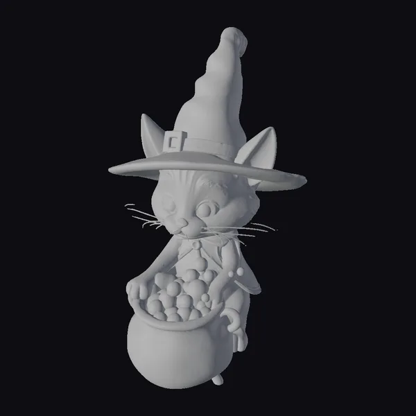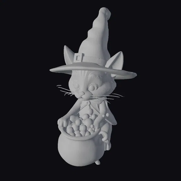 Delicately posed in a cauldron, this charming black cat dons a tall, curved witch’s hat and a matching black cloak adorned with colorful buttons. The cat’s face is a masterpiece of detail, with vibrant yellow eyes that seem to gleam in the dark, long whiskers, and a tiny pink nose. The cauldron, filled with a bubbling orange potion and emitting a soft green glow, adds a sense of mystique and ancient magic to the scene. The overall stylized design, complete with smooth textures and a vibrant color palette, makes this 3D model perfect for Halloween-themed projects, animations, or 3D printing. Its whimsical nature also lends itself well to use in games, virtual reality experiences, and fantasy designs.