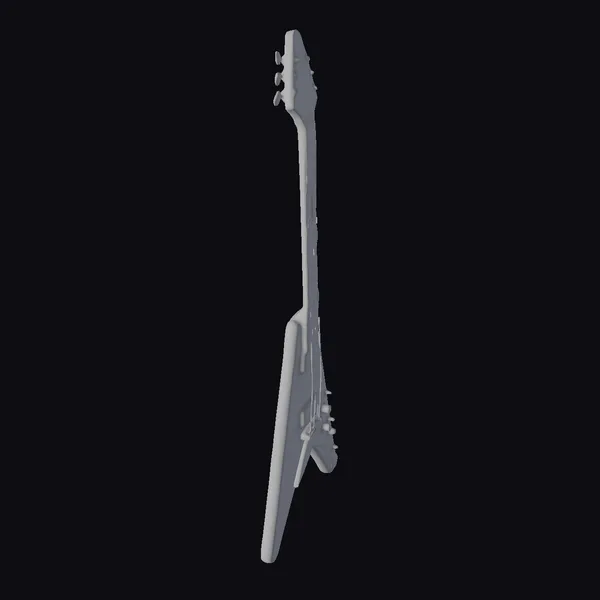Positioned dynamically in mid-air, the guitar’s black and metallic surfaces gleam under sharp lighting, highlighting its sharp edges and pointed headstock. The fretboard, made of a warm-toned wood, contrasts beautifully with the cool tones of the body. This stylized model captures the essence of a high-energy rock instrument, perfect for projects needing a bold, futuristic vibe. Ideal for use in game development, animation projects, or architectural visualizations where a touch of edgy style is desired.