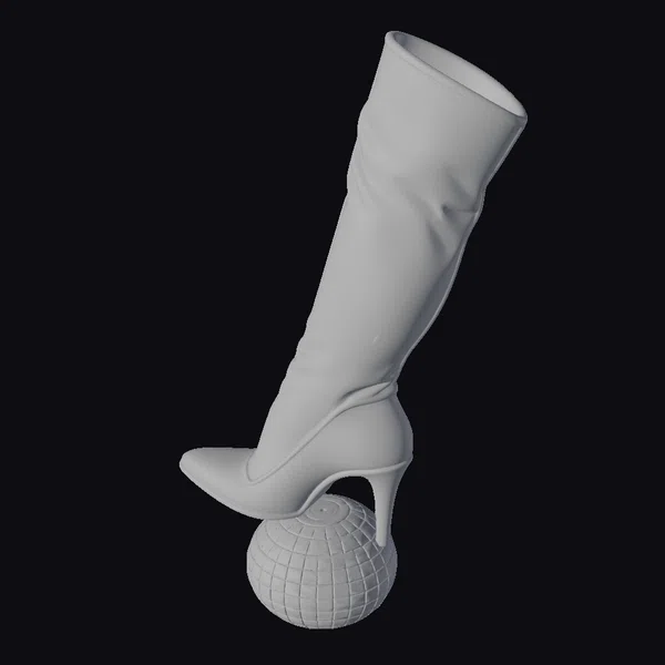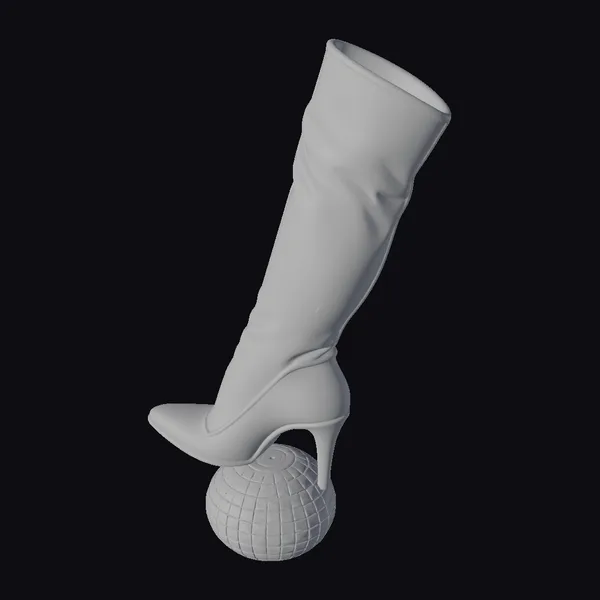 Positioned dynamically on a reflective disco ball, the boot’s glossy black leather appears almost liquid, as if molded to perfection. The tall shaft, slightly wrinkled for a natural look, transitions smoothly into a pointed toe and stiletto heel, emphasizing the boot’s sleek lines. The high-quality texture and lighting highlight the material’s suppleness and shine, making it perfect for projects requiring detailed, realistic footwear. Ideal for use in fashion design, animation, or virtual reality, this model captures the essence of high-end fashion. The boot’s dramatic pose on the disco ball adds a playful, nightlife-inspired vibe.