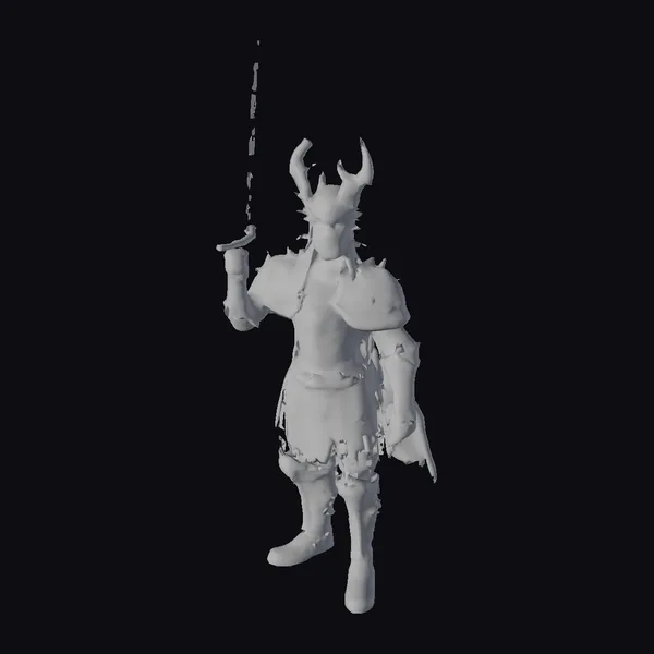 Standing imposingly with one foot forward, the black knight’s armor is a marvel of dark fantasy design. The suit is adorned with spikes and jagged edges, suggesting a fearsome warrior not to be underestimated. The helmet, complete with curved horns, adds to his intimidating stature, while the sword in his hand appears as if it’s been drawn for a decisive blow. The texture of the armor suggests a battle-worn veteran, with each piece meticulously detailed to convey a sense of realism and weight. This model is perfect for projects requiring a dark, medieval aesthetic, such as games, animations, or designs that aim to evoke a sense of mystery and danger. Its high level of detail makes it suitable for close-up shots, allowing for a deep dive into the craftsmanship of the armor and the menacing aura of the knight.