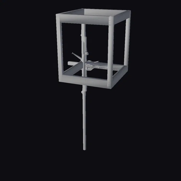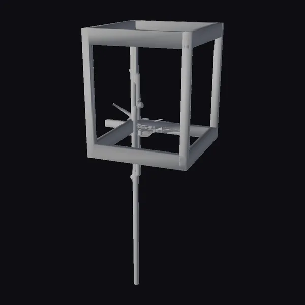 Positioned dynamically on a metallic rod, this black metal test fixture boasts a robust cube-shaped frame with a hollow interior, showcasing intricate internal mechanisms. The fixture’s modern design and industrial aesthetic make it a versatile asset for various applications, from engineering and product design to architectural visualizations and technical illustrations. Its detailed structure and metallic textures offer a realistic and engaging visual representation, ideal for enhancing scenes in games, animations, and simulations. The fixture’s sleek appearance and technical details invite viewers to explore its functionality and purpose.