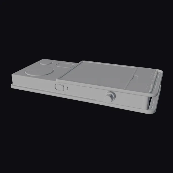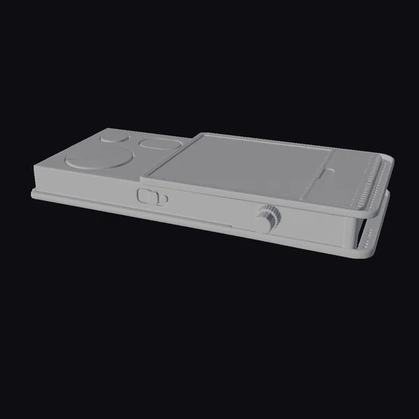 Rendered with meticulous detail, the black sci-fi pocket phone boasts a compact design with a predominantly black color scheme, accented by a red light and a soft green glow. The device features a small screen displaying a futuristic interface and a circular control on its top left. Positioned at an angle, the phone’s texture suggests a durable, high-tech material. Its futuristic design makes it a perfect fit for sci-fi projects, games, or animations where a cutting-edge gadget is needed. The model is versatile, suitable for close-up shots or as part of a larger scene, offering flexibility for various creative applications.