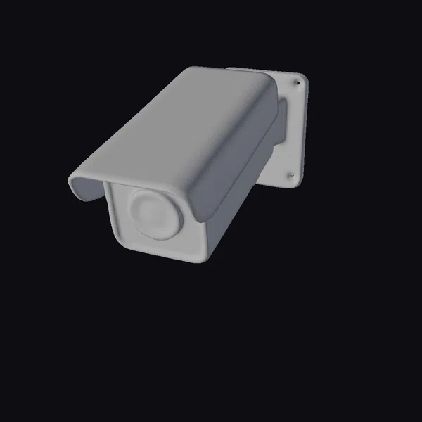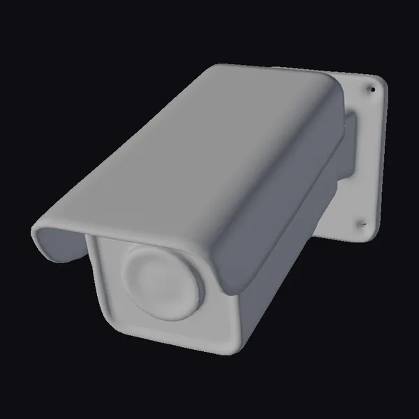Positioned at a slight angle, the camera’s rectangular body is prominently displayed, showcasing its sturdy design and sleek black finish. The lens, situated at the front, appears ready to capture every detail. The wall-mounted plate, also black, seems sturdy and dependable. The overall design screams modern security, ideal for use in various settings such as offices, homes, or public spaces. Its discreet nature makes it perfect for integration into 3D models of buildings, security systems, or smart homes for architectural visualization, gaming, or animation projects.