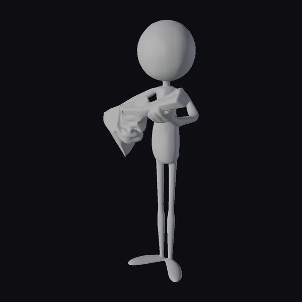 Detailed in its simplicity, the black stick figure stands with a rounded head and a body composed of basic lines and shapes. The figure holds a cyan geometric shape that has sharp, angular lines and a hollow center, adding a touch of complexity to the overall minimalist design. The contrast between the black figure and the cyan object is striking. The model’s simplicity makes it versatile for various applications, including games, animations, and design projects where a stylized, abstract character is needed. Its unique design can be used to represent a character in a futuristic or abstract setting, offering a clean and modern aesthetic.