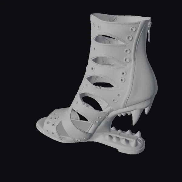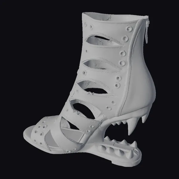 Crafted with meticulous attention to detail, this boot boasts a black exterior adorned with metallic studs, adding an edgy touch to any outfit. The red interior provides a pop of color, while the heel’s jagged design evokes a sense of fierce elegance. Standing tall, this boot makes a statement with its unique blend of style and daring design. Perfect for those who dare to be different, it’s ideal for use in fashion design, animation, or as a prop in creative projects.