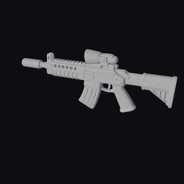 Positioned dynamically, the rifle’s body is a marvel of detailed craftsmanship, with a matte black finish that seems to absorb light. The green glow of the scope adds a touch of high-tech readiness, suggesting a weapon prepared for action. The ribbed texture on the grip and fore-end provides a secure hold, while the silencer at the end of the barrel hints at stealth capabilities. This model excels in applications requiring a realistic and menacing firearm, such as game development, animation projects, or architectural visualizations where a sense of realism and tension is needed. Its detailed appearance makes it suitable for close-up shots or scenes where the weapon is a focal point.