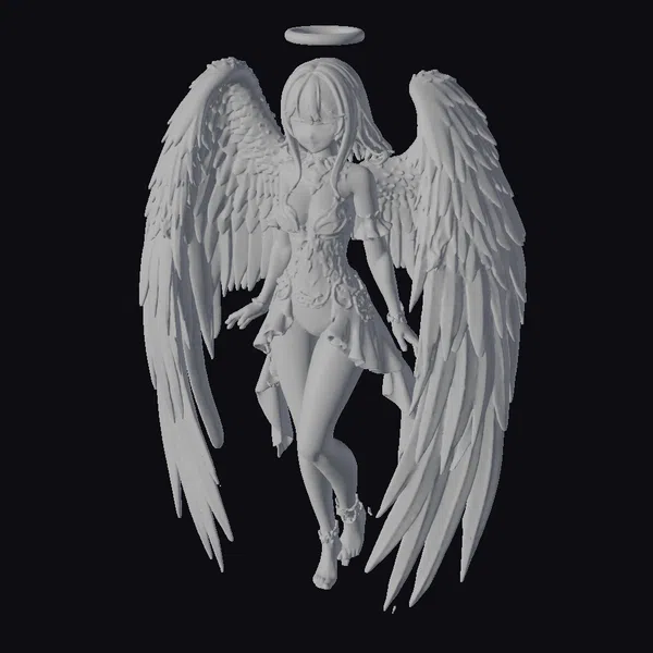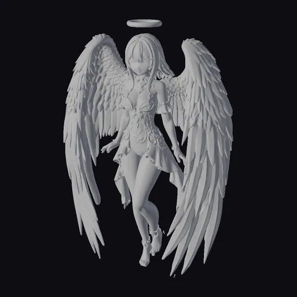 Floating gently above the ground, this beautiful angel figure is poised in a serene stance, with her white wings spread wide behind her. Her long blonde hair cascades down her back, framing her face and complementing her bright blue eyes. The intricate details of her white and gold outfit, complete with blue gemstones, are meticulously rendered, showcasing the model’s high level of quality. The subtle gradient of her wings, transitioning from white to blue, adds a sense of depth and dimensionality. This model is perfect for use in games, animation, or 3D printing, where a touch of angelic serenity is desired.