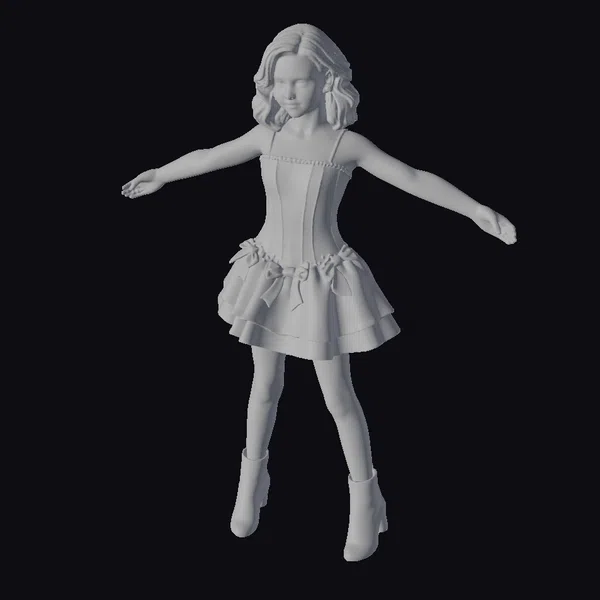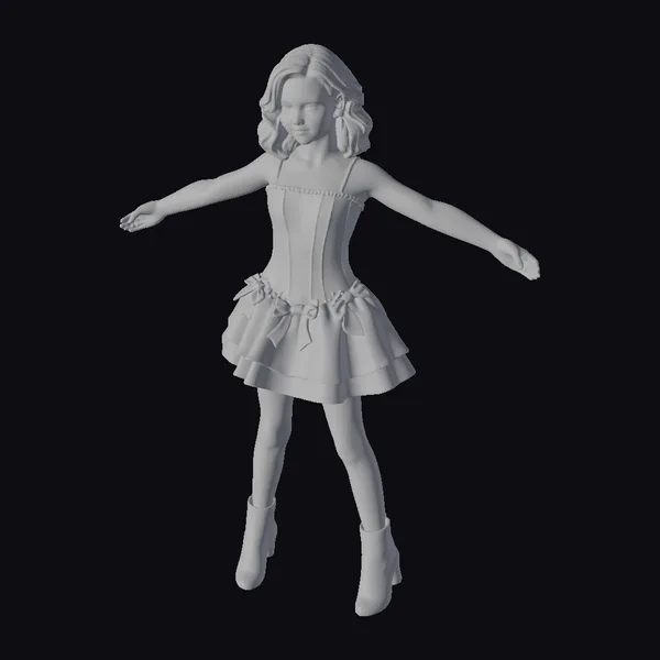 Detailed in every aspect, this 3D model of a young blonde girl showcases a dynamic pose with outstretched arms, inviting the viewer into a scene of youthful exuberance. Her blonde hair is styled in loose waves, adding to her carefree and lively demeanor. The black dress, adorned with a ruffled skirt, hugs her figure, while black boots add a touch of edginess to her overall appearance. The model’s facial features are delicately rendered, capturing a look of serene confidence. The white background ensures that the focus remains on her, making her a versatile asset for various projects. Whether it’s for animation, game development, virtual reality experiences, or even architectural visualization, this model can bring a touch of realism and relatability. Her detailed textures, from the smoothness of her skin to the intricate folds of her dress, make her a high-quality addition to any creative project.