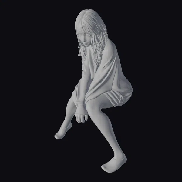 In a pose that speaks volumes about relaxation and introspection, this 3D model of a young blonde girl captures a moment of serene contemplation. She is dressed in a white sweatshirt with intriguing black text on the sleeves, paired with gray shorts and white shoes, creating a casual yet stylish look. The model’s facial features are delicately rendered, with a focus on realistic skin texture and hair follicles that add depth to her appearance. The pose, with her legs bent and arms relaxed, conveys a sense of readiness to spring into action or simply to sit back and observe. The model’s proportions are accurate, with careful attention to the human anatomy, making it suitable for various applications, including games, animation, virtual reality, and design projects. The high level of detail in this model, from the strands of her blonde hair to the stitching on her shoes, ensures a lifelike representation that can enhance any visual project.