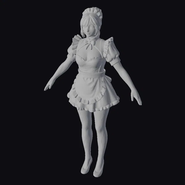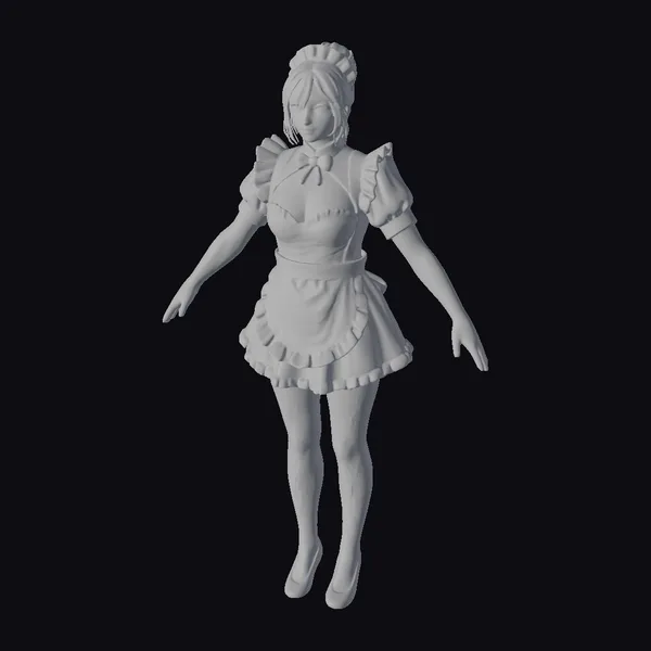 Standing with her arms relaxed by her sides, this stylized maid character exudes a sense of friendliness and approachability. Her blonde hair is styled in a neat bun, adorned with a white headpiece that matches the frilly details on her black dress and white apron. The outfit is a perfect blend of playful and professional, with a sweetheart neckline and short sleeves adding to its charm. The model’s facial features are delicately rendered, with a subtle smile and gentle eyes that invite the viewer. This 3D model would be perfect for use in games, animation, or 3D printing projects where a cute and charming character is needed.