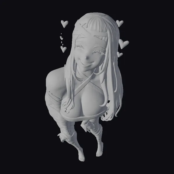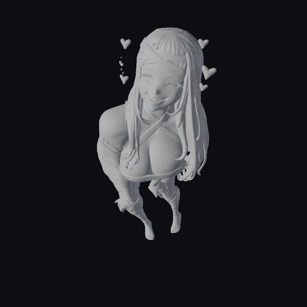 This stylized 3D model of a blonde mummy girl showcases intricate details, from the crisscrossing bandages on her body to the gradient blonde hair with pink tips. Her playful pose, complete with a sly wink and blushing cheeks, adds to her allure. The red hearts floating around her head amplify the flirtatious atmosphere. Ideal for use in games, animations, or designs requiring a unique blend of fantasy and charm.